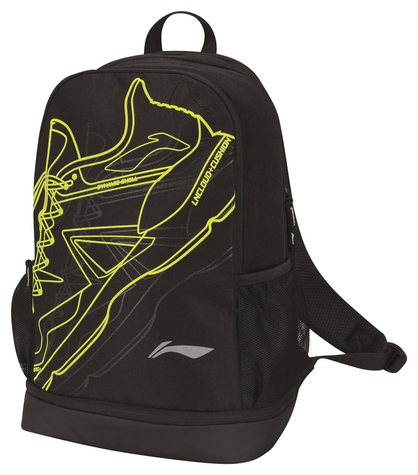 The Li-Ning Sonic Boom Badminton Backpack - Black showcases a sleek design highlighted by a yellow outline of a running shoe. It features convenient elements such as a top handle, padded shoulder straps, and mesh side pockets. The backpack offers a spacious main compartment for storing all your essentials.